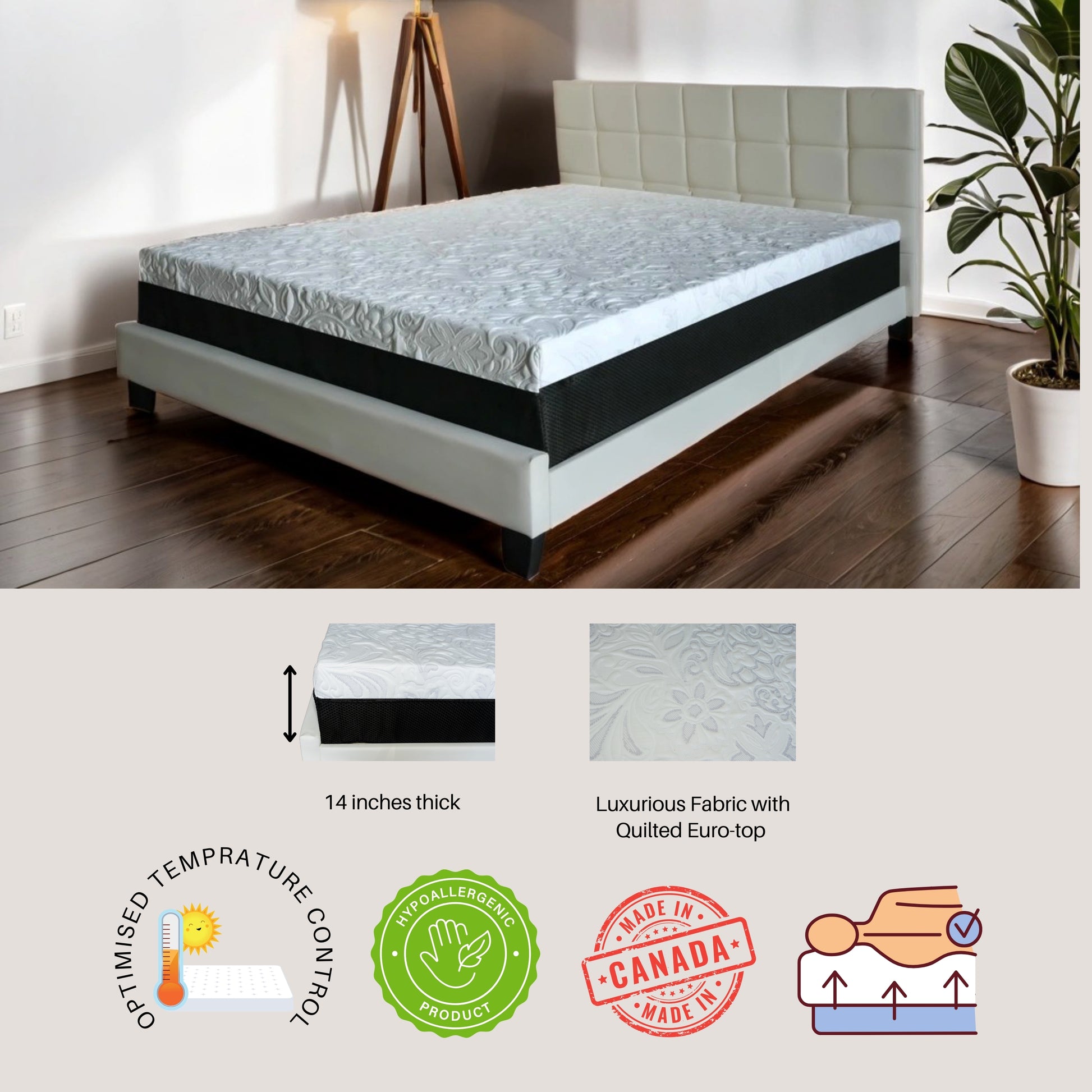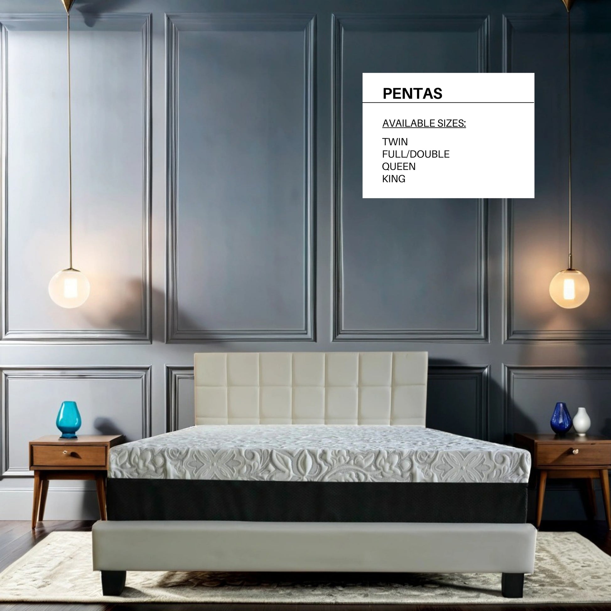 Choose the perfect fit for your bedroom with the PANTAS mattress, which is available in all standard sizes, including Twin, Full, Queen, and King. You can also select from two thickness options: 14", allowing you to find the ideal mattress that suits your personal preference and bed frame.