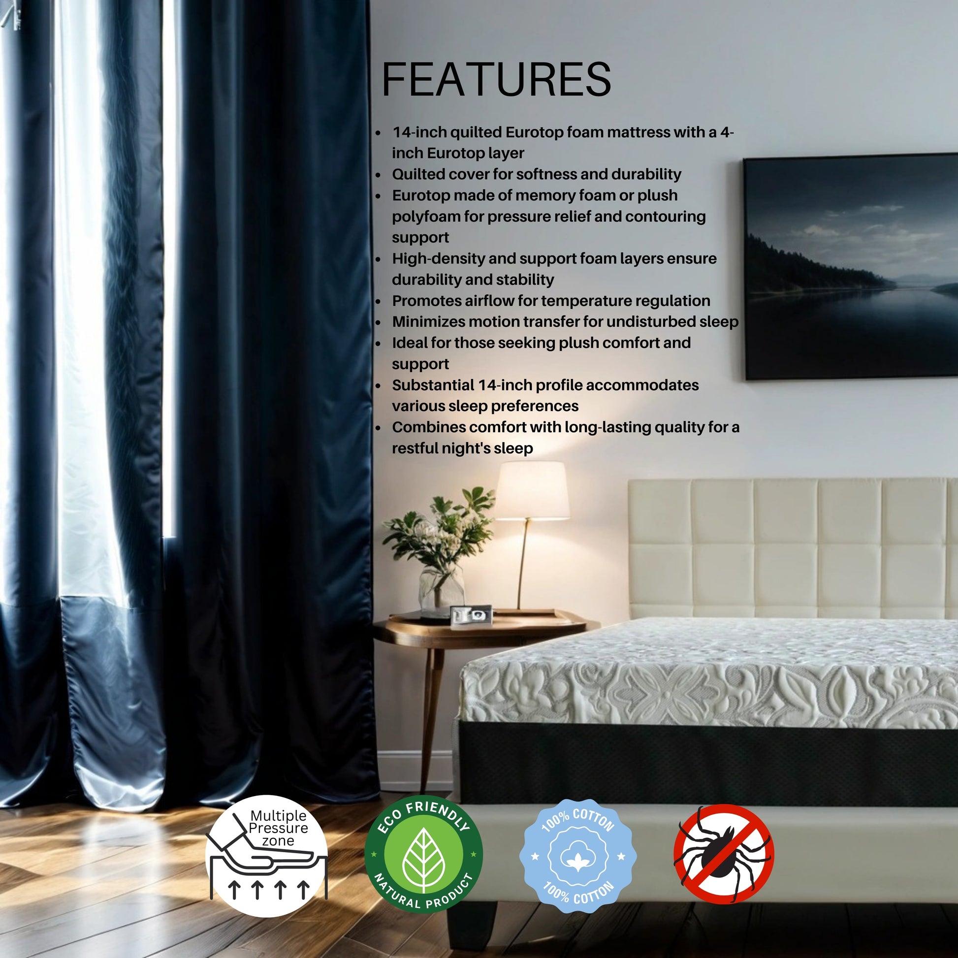 Experience luxurious comfort and support with PANTAS' 14 INCH, POCKET COIL-TIGHT TOP MATTRESS. This medium-firm mattress is perfect for all sleep positions and features advanced cooling technology to keep you at the ideal temperature. Made with organic bamboo fabric, it's not only soft and gentle on your skin, but also environmentally responsible. The breathable construction ensures a fresher, drier sleep and minimizes motion transfer for undisturbed rest.